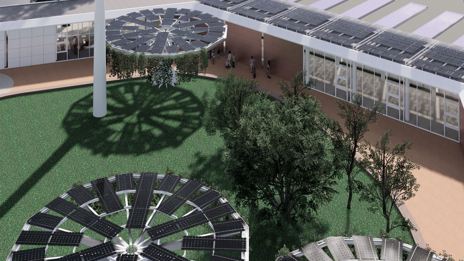 Col·locació de plaques fotovoltaiques a coberta i a unes estructures autònomes anomenades “arbres-metàl·lics” que també generen ombres que redueixen la radiació directa del sol i augmentant la ventilació a la sala de bombes per baixar la temperatura. Amb tot això aconseguim millorar la qualificació energètica de l’edifici per reduir el consum energètic.